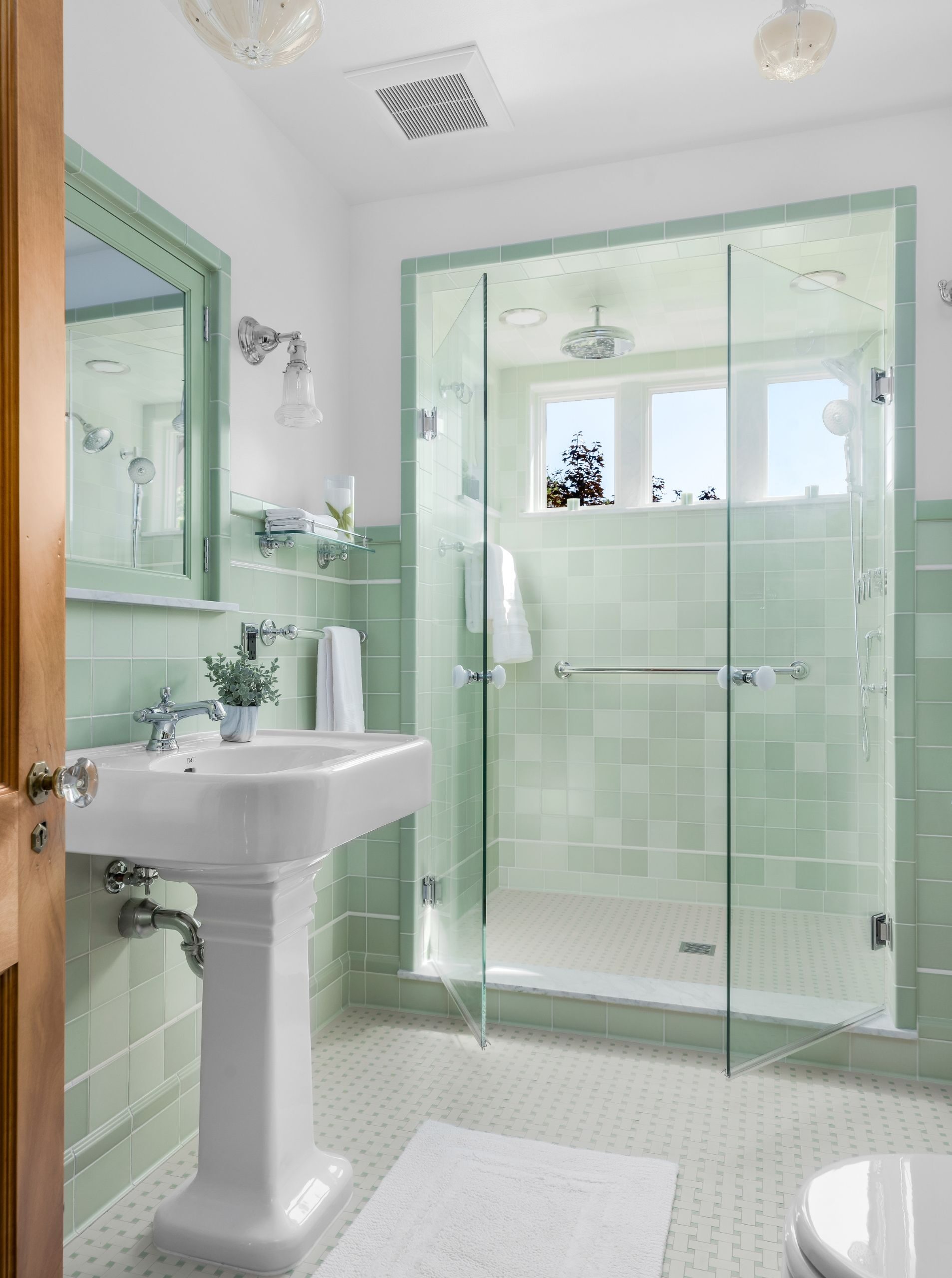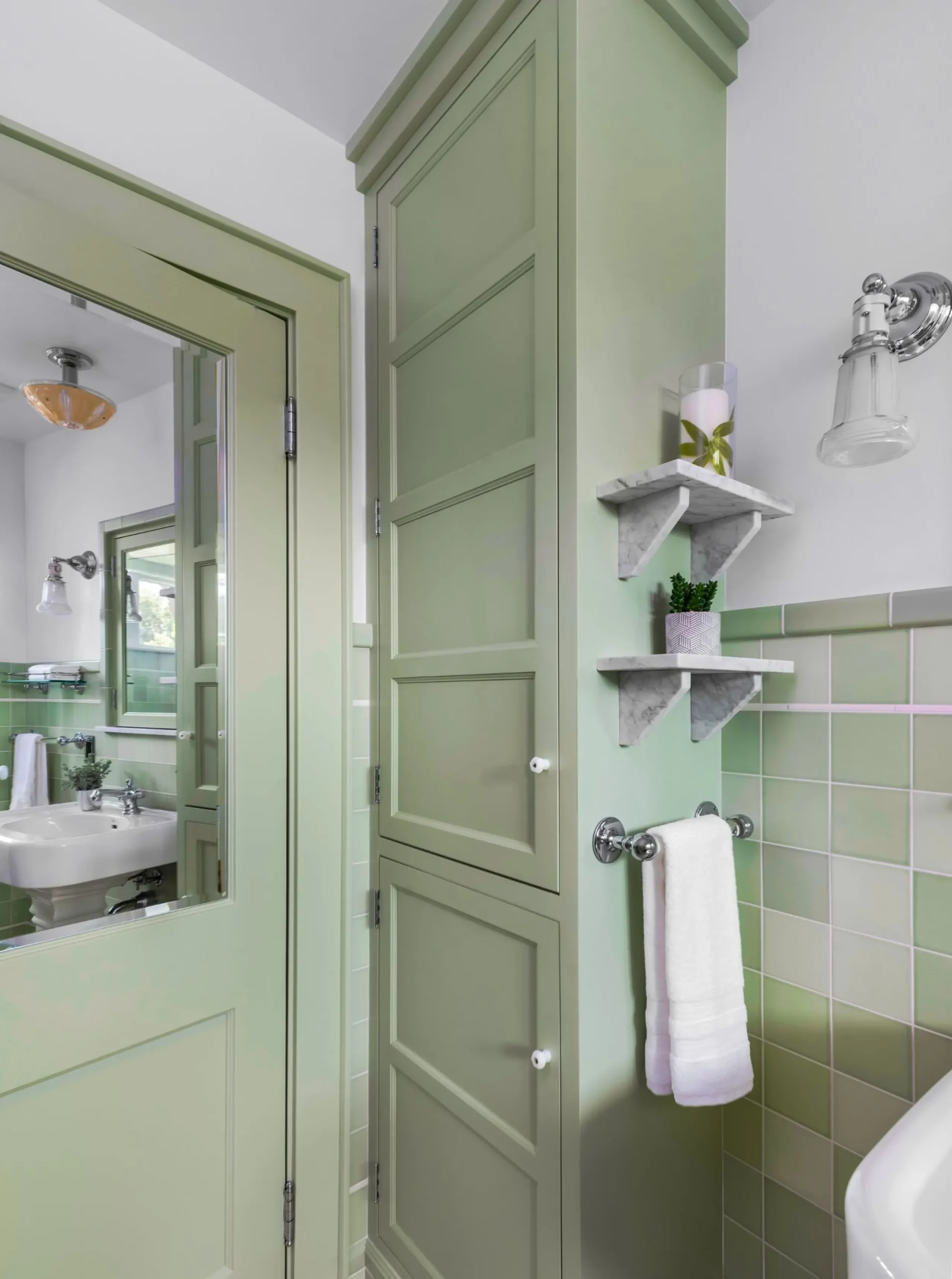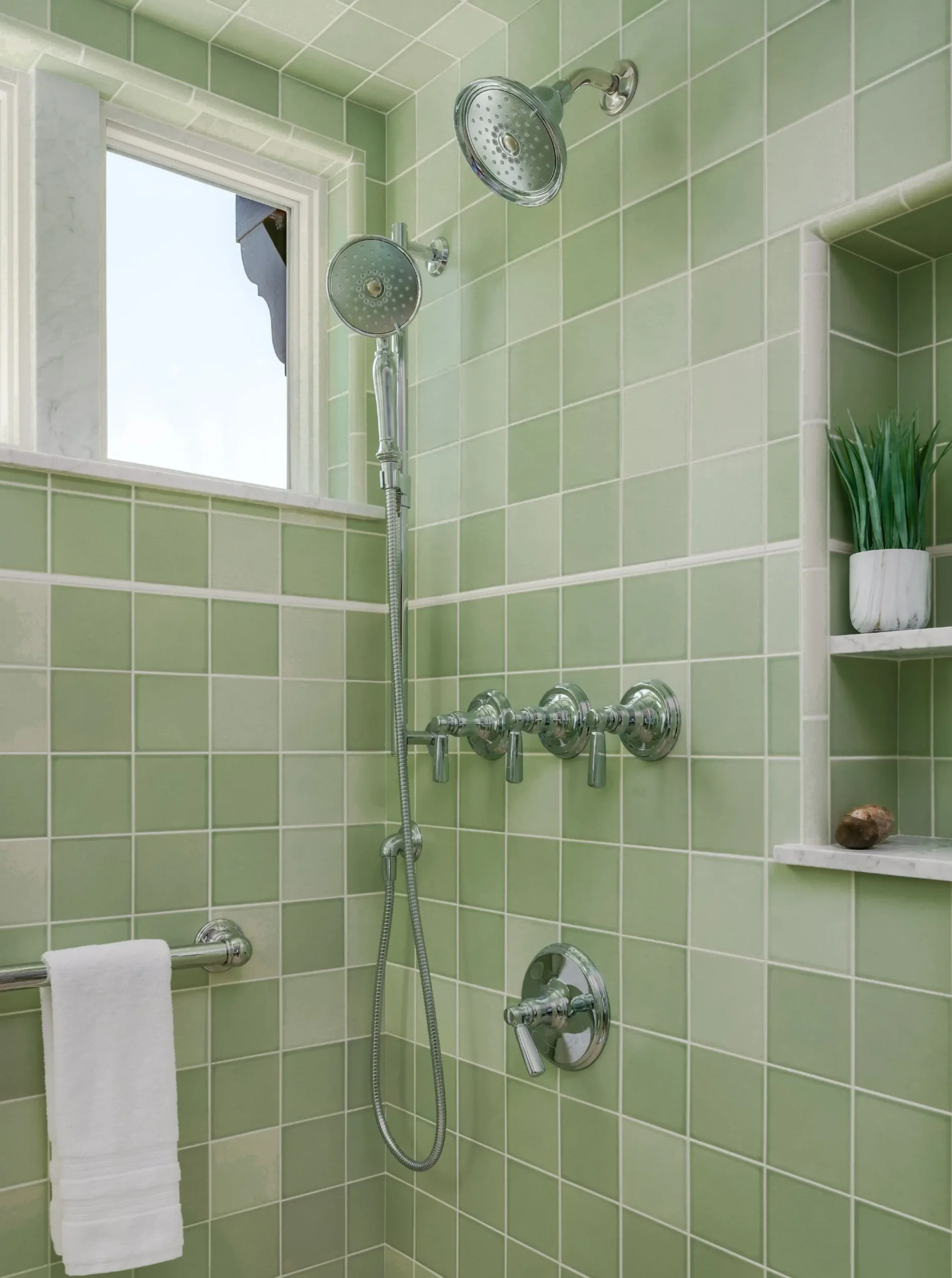 In Vintage Beauty, every detail was meticulously crafted to bring the client’s vision to life, including a clever bump-out extension to solve a space challenge and add a spacious walk-in shower. The vintage green bathroom design inspiration came from a magazine picture chosen by the client years ago, which they described as their dream bathroom. We worked hard to ensure every detail matched this vision perfectly.