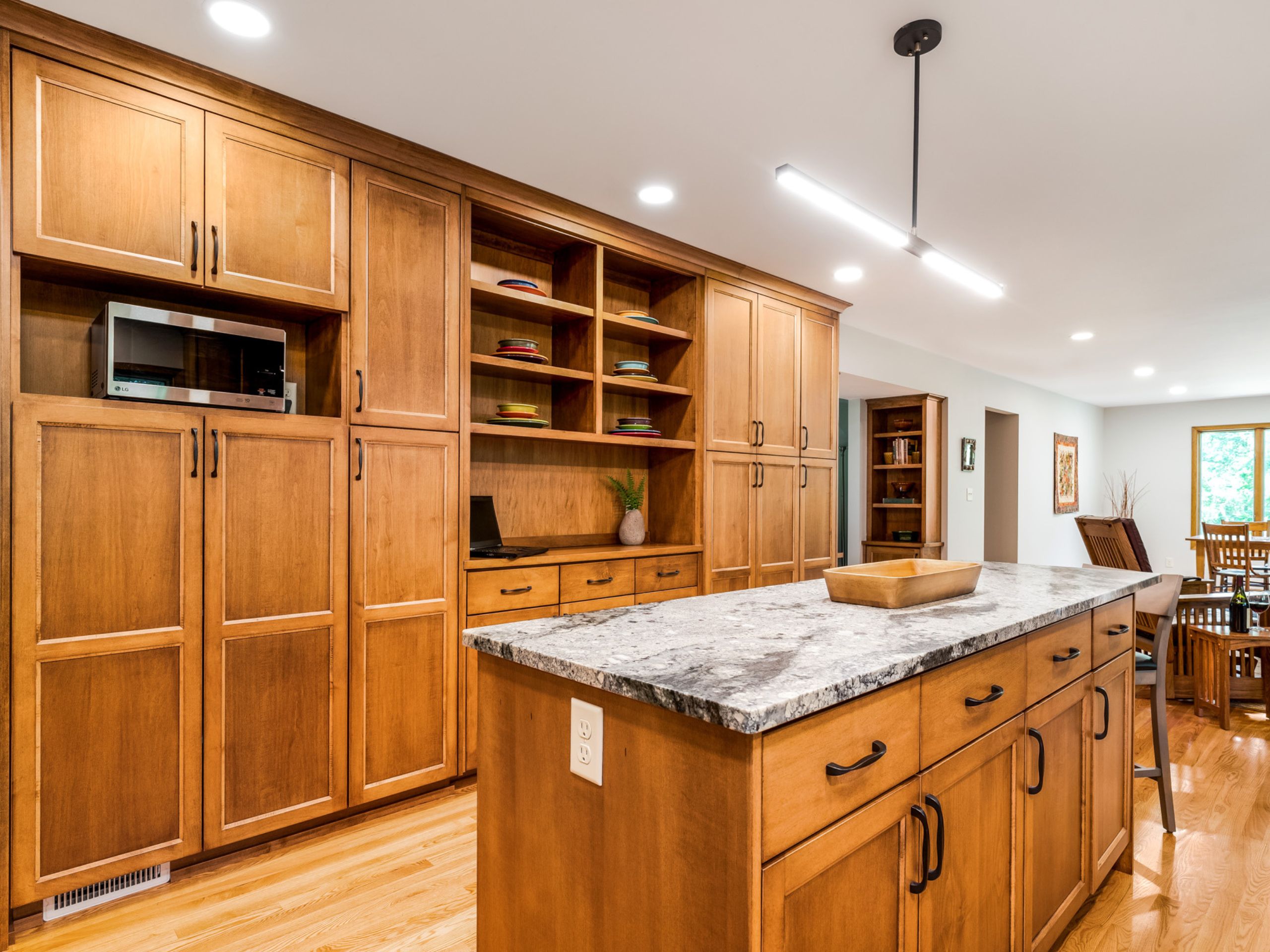 Drawers in base cabinets are a very popular feature. Turns out even marathon runners don’t like to squat down and shove their heads inside a cabinet to grab the soup pot. Cabinets can be fitted with a variety of features that make it easier to reach what’s inside. Pull-out shelves, drop-down shelves, lazy Susan inserts, and pull-out trash and recycling bins are usability winners. Rolling carts provide additional storage space that is easy to reach and can be stored in knee spaces. Open shelves are also a popular and stylish universal design trick.