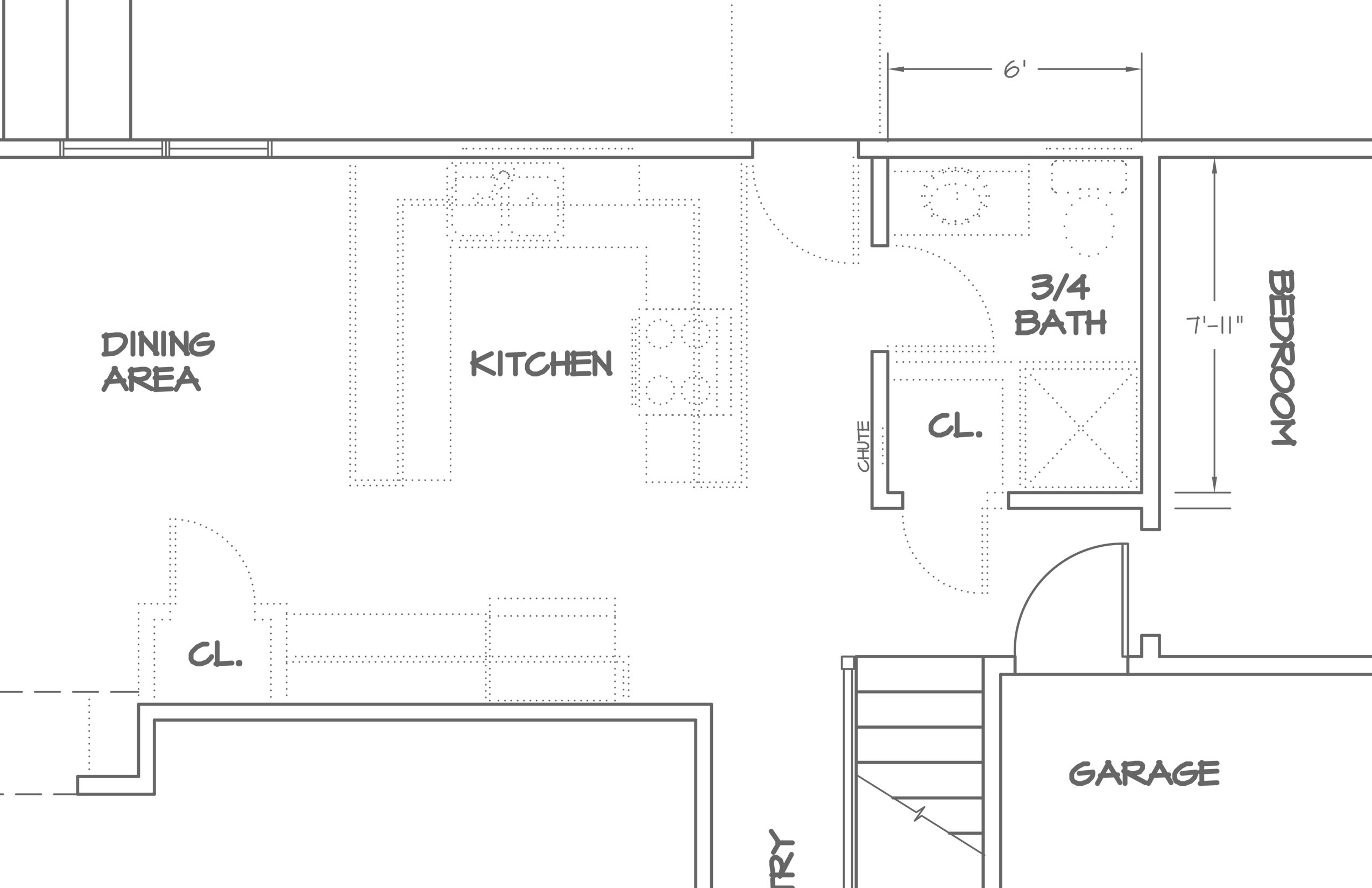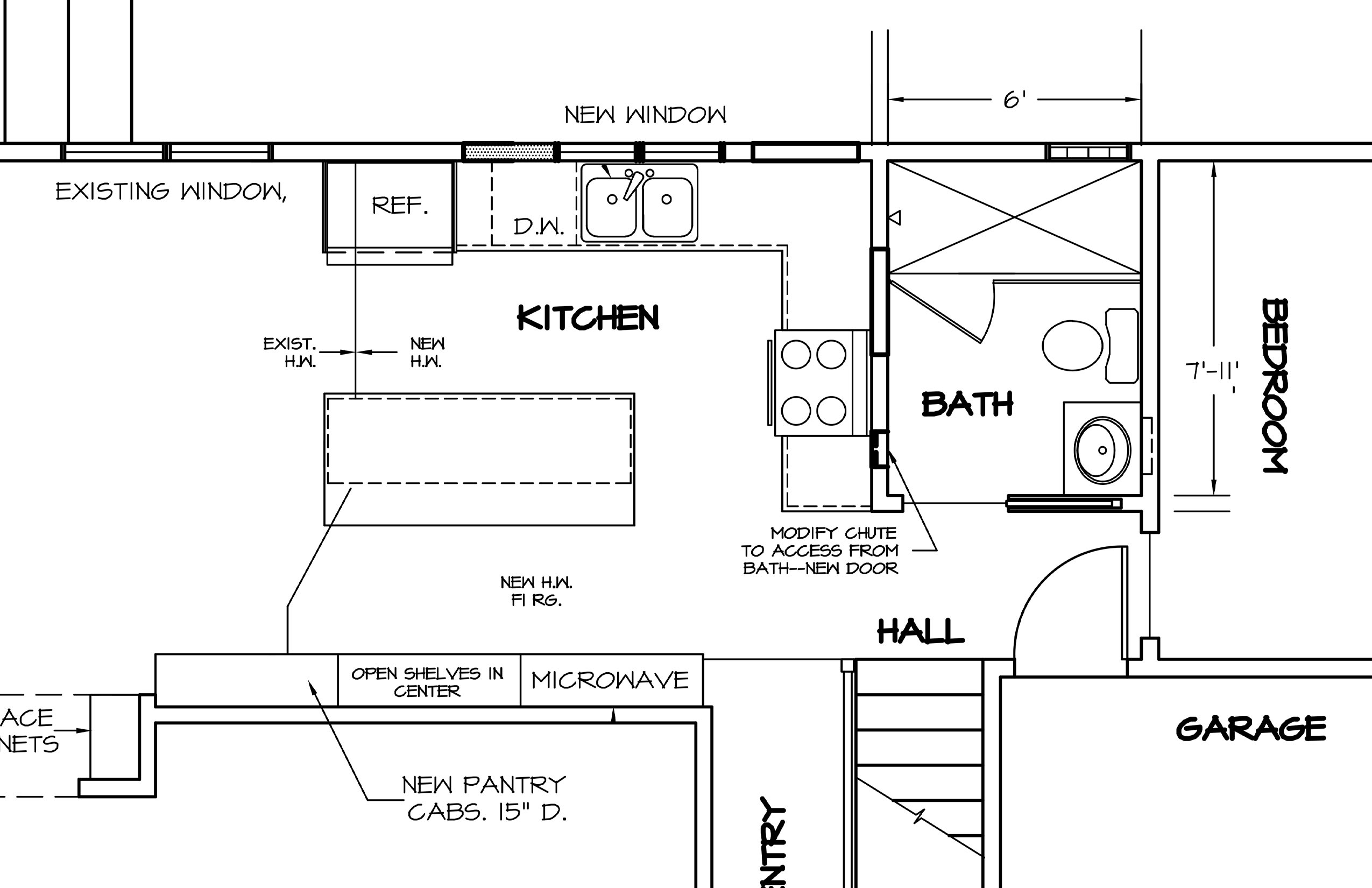 We removed the hallway between the kitchen and the 3/4 bath. This opened up the kitchen and created more space for people, storage, and cooking.