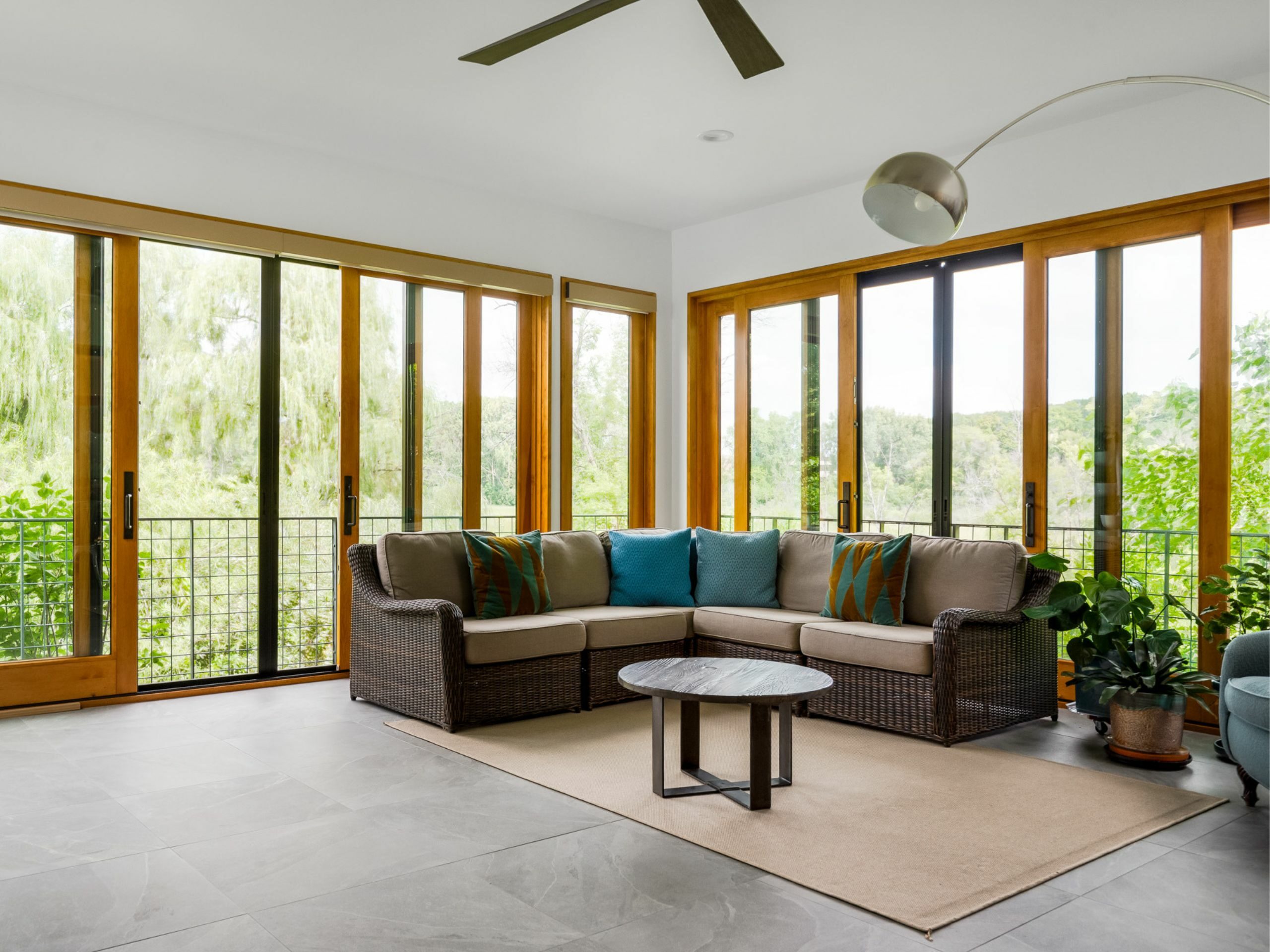 A deck-to-porch conversion creates a year-round sanctuary that blends with both the modern design of the home and its natural surroundings.