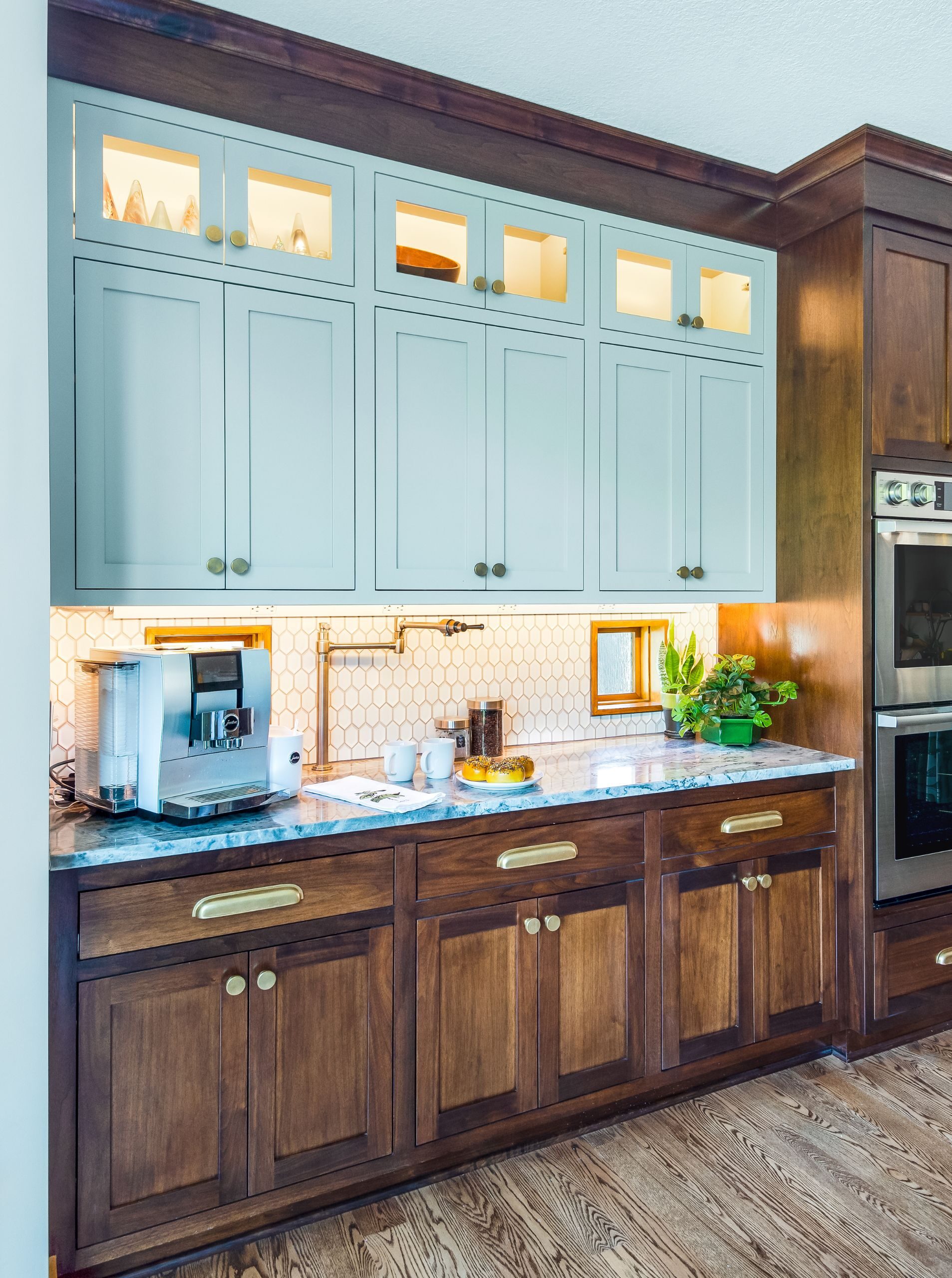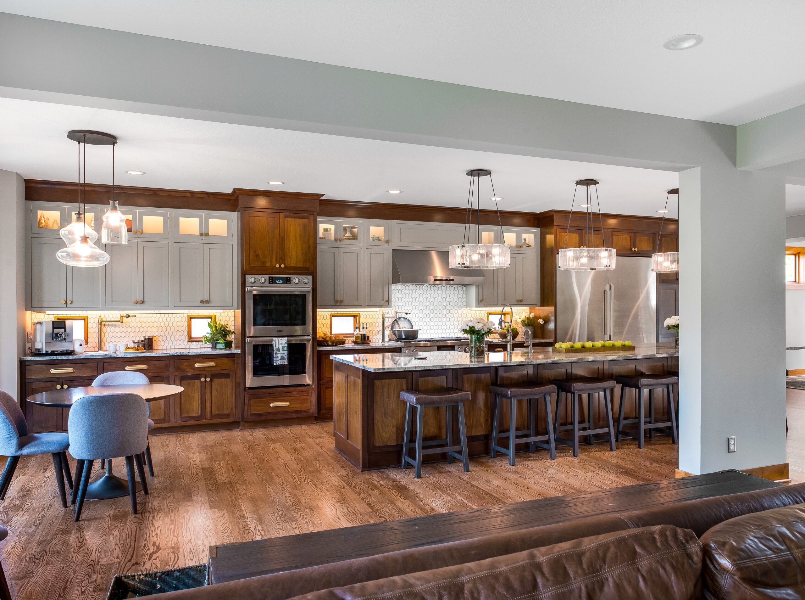 The kitchen features two styles of cabinets: Dorian Grey and Walnut Stain, elegantly framed by class cove crown molding. The breakfast bar showcases this beautiful blend of cabinetry, complemented by a white small-format hex tile backsplash and a sleek countertop.