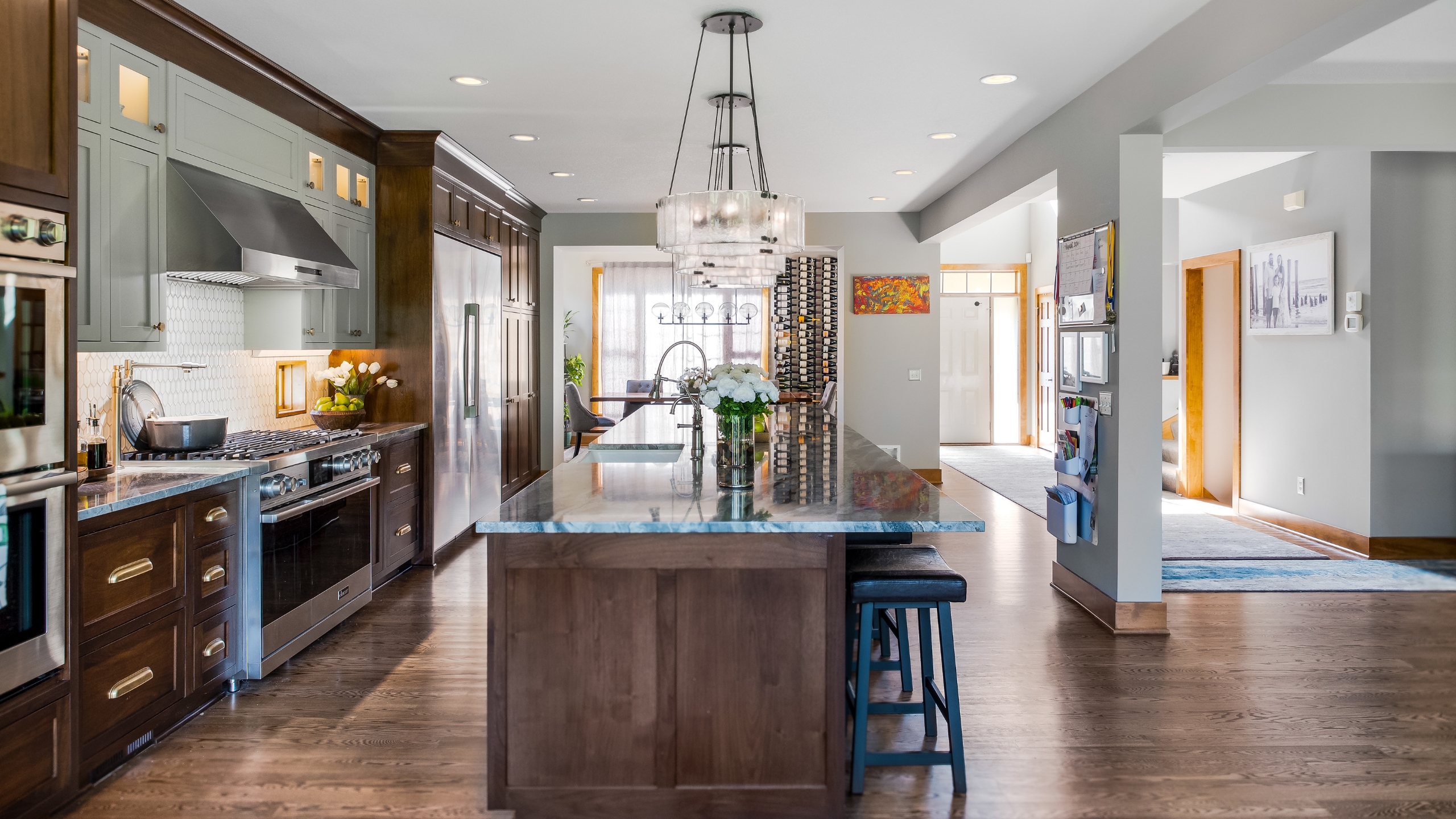 We expanded the kitchen into the dining room and relocated the dining area to the former sitting room, creating a natural flow into the family room just off the kitchen.