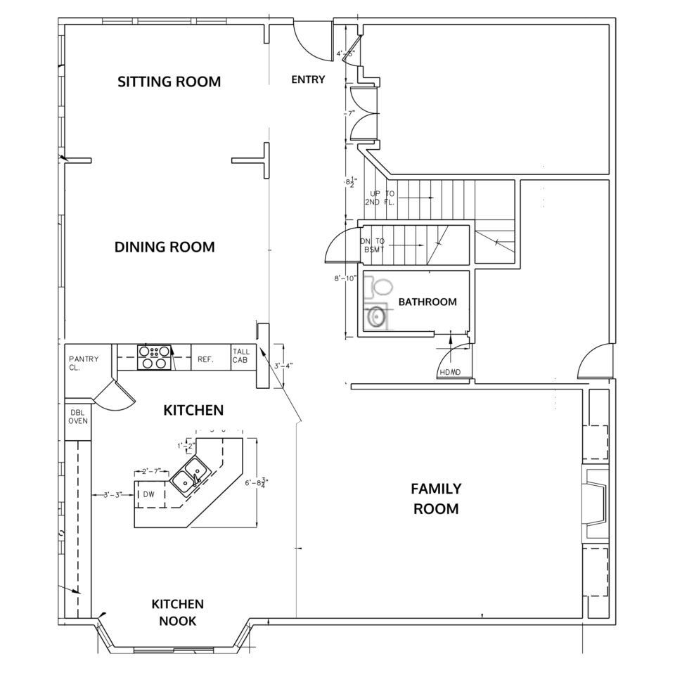 Here, you can see the wall we removed between the existing kitchen and dining room. This change allowed us to incorporate the old dining room into the expanded kitchen, while the former sitting room was repurposed as the new dining area. We creatively relocated plumbing lines in the original wall to fully open up the first floor, nearly doubling the kitchen’s size.