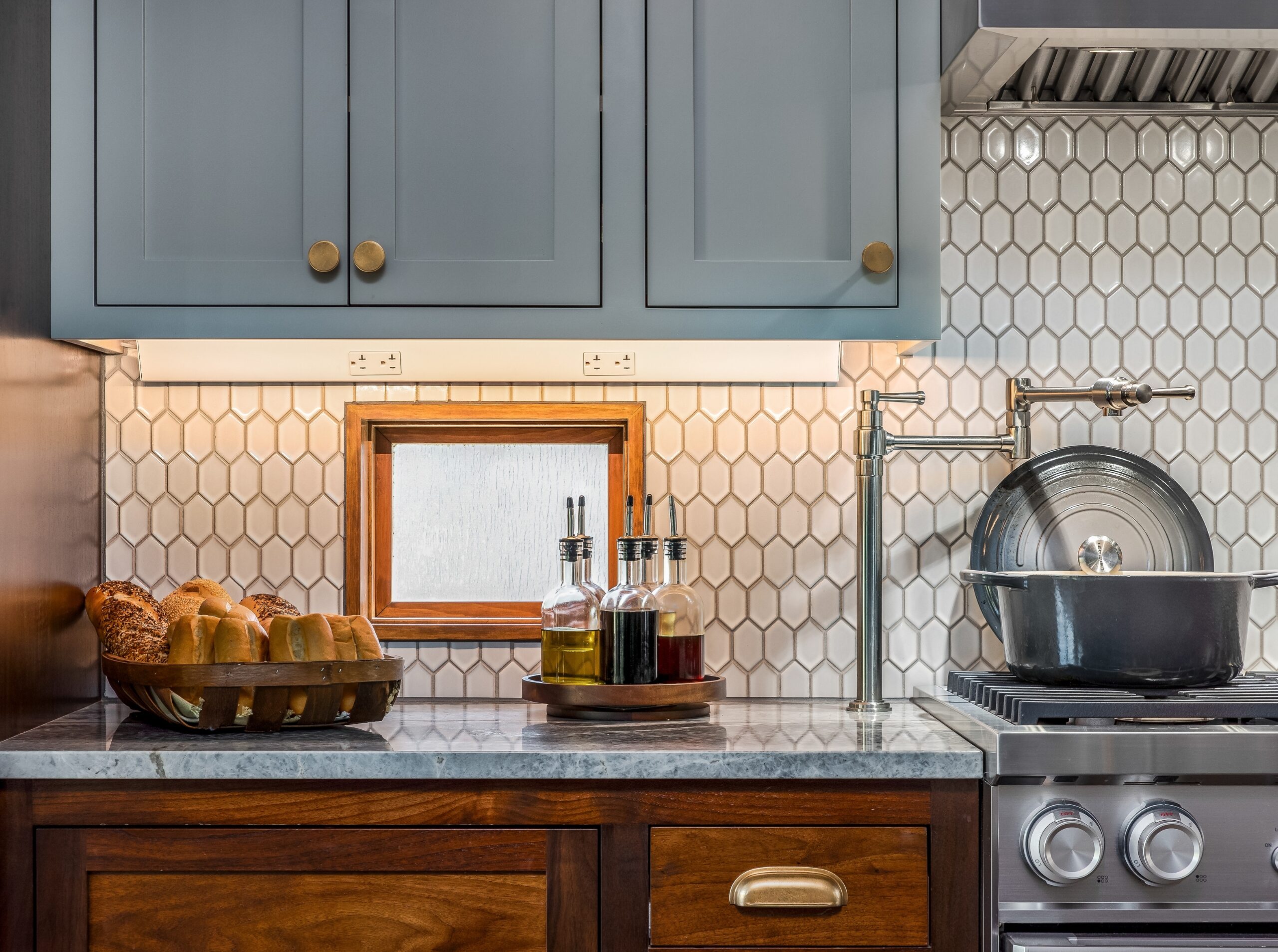One of two custom kettle faucets—one by the stove and the other at the coffee bar—adds extra functionality to this kitchen. Under-cabinet lighting with a hidden power strip keeps things bright and tidy. The windows along the backsplash were kept for natural light. To avoid a direct view into the neighbor’s house, we added privacy glass.