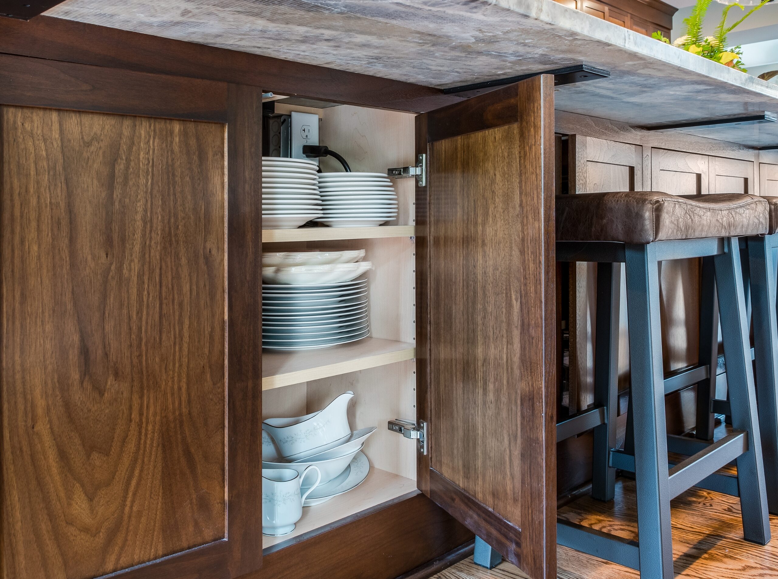 Maximizing every inch of this 17-foot island, the double-sided design makes smart use of space. On the working side, you’ll find custom cabinetry solutions, an under-cabinet microwave, a dishwasher, and plenty of storage. On the seating side, there’s even more storage—perfect for keeping things organized while maintaining a clean, sleek look.