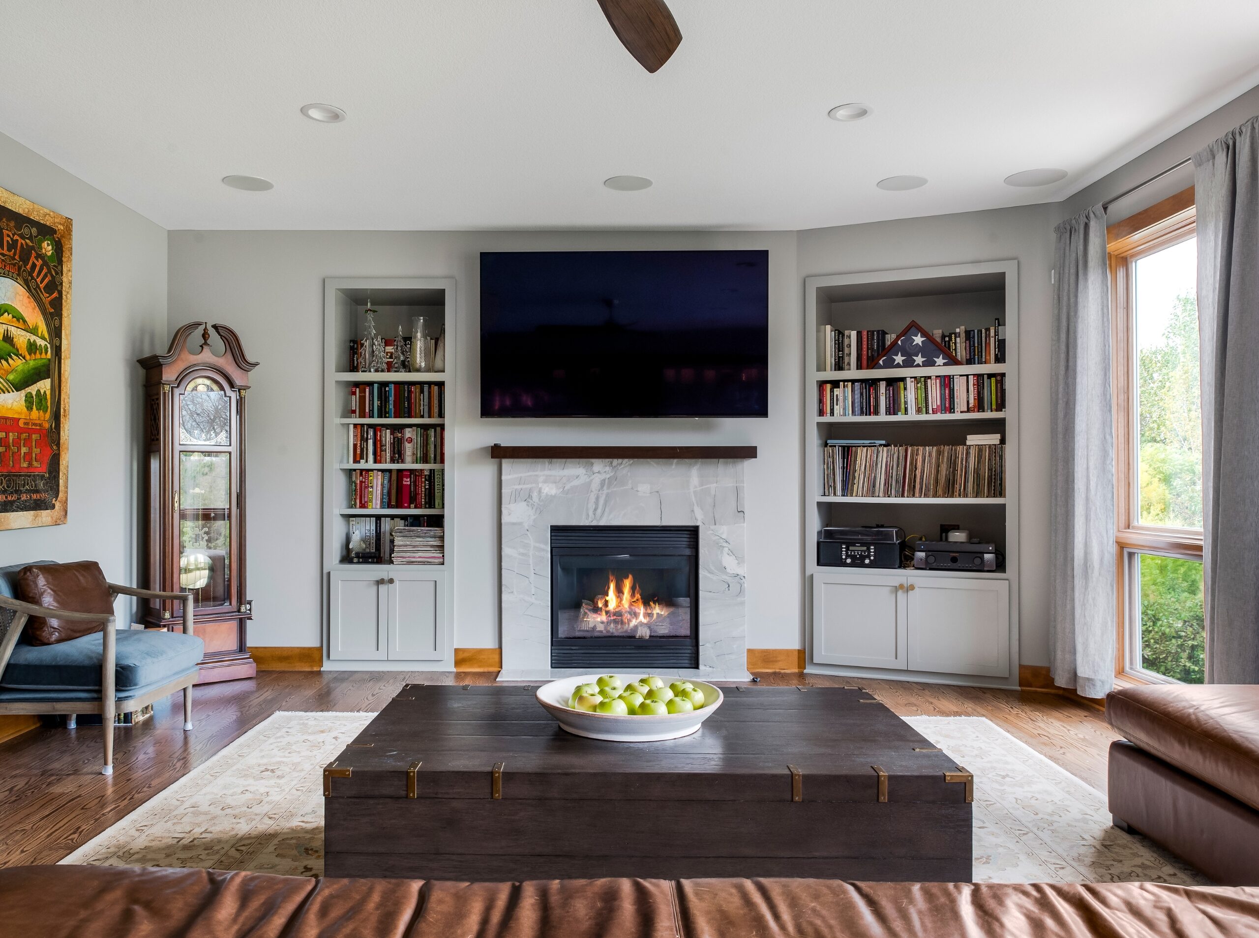 Adjacent to the kitchen, the family room receives a refreshing update. We added recessed can lighting for a bright, welcoming atmosphere. Also, installed new millwork on the windows for a polished look. Additionally, we refaced the fireplace with marble, added a new hearth, and installed a classic wood mantel—adding warmth and elegance to the space.