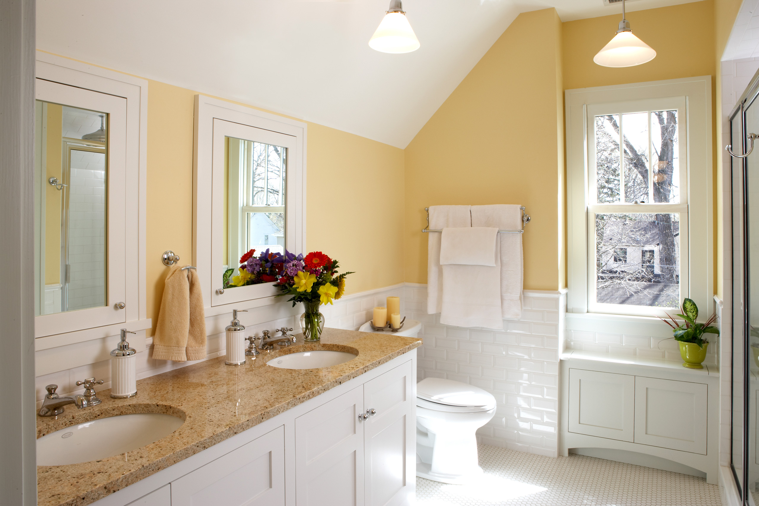 The cheerful new bathroom gives them a place to wake up and wind down in peace. And custom built-in cabinets provide efficient and much-needed storage.