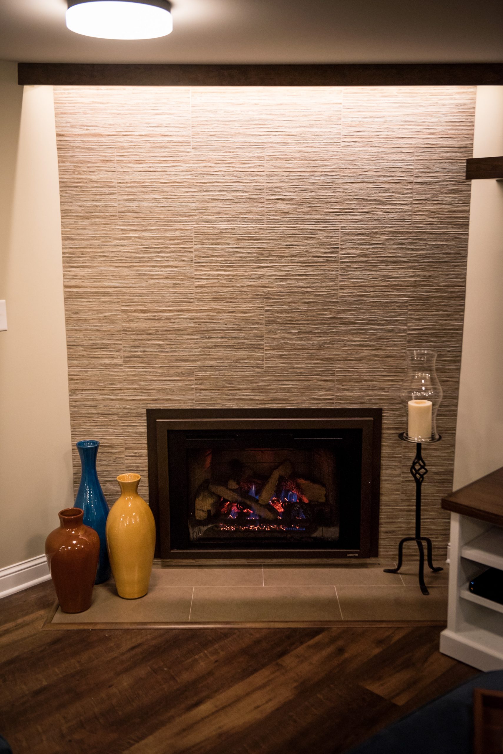 The wood-burning fireplace was replaced with a gas fireplace faced with porcelain tiles.