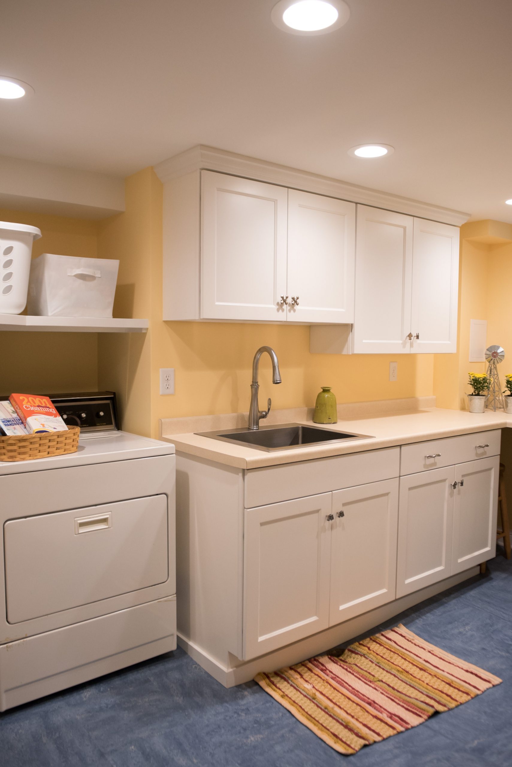 The definition of a “basement laundry room” gets rewritten with this bright cheery room, warmed with buttery yellow paint and ample lighting.
