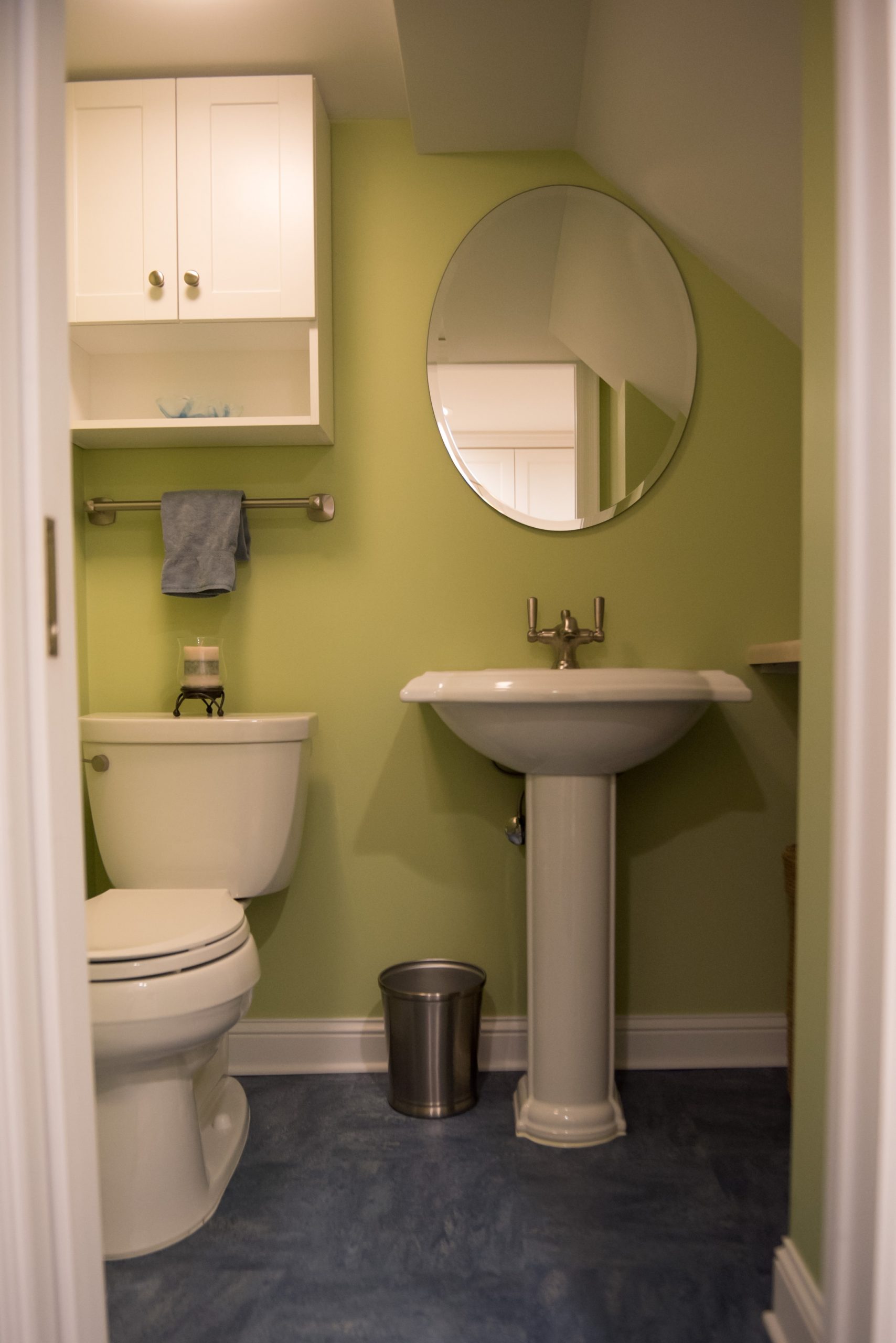 Continuing the colorful theme, we used bright celery green in the powder bath. What a change from the tiny space with only the “workmen’s toilet”!