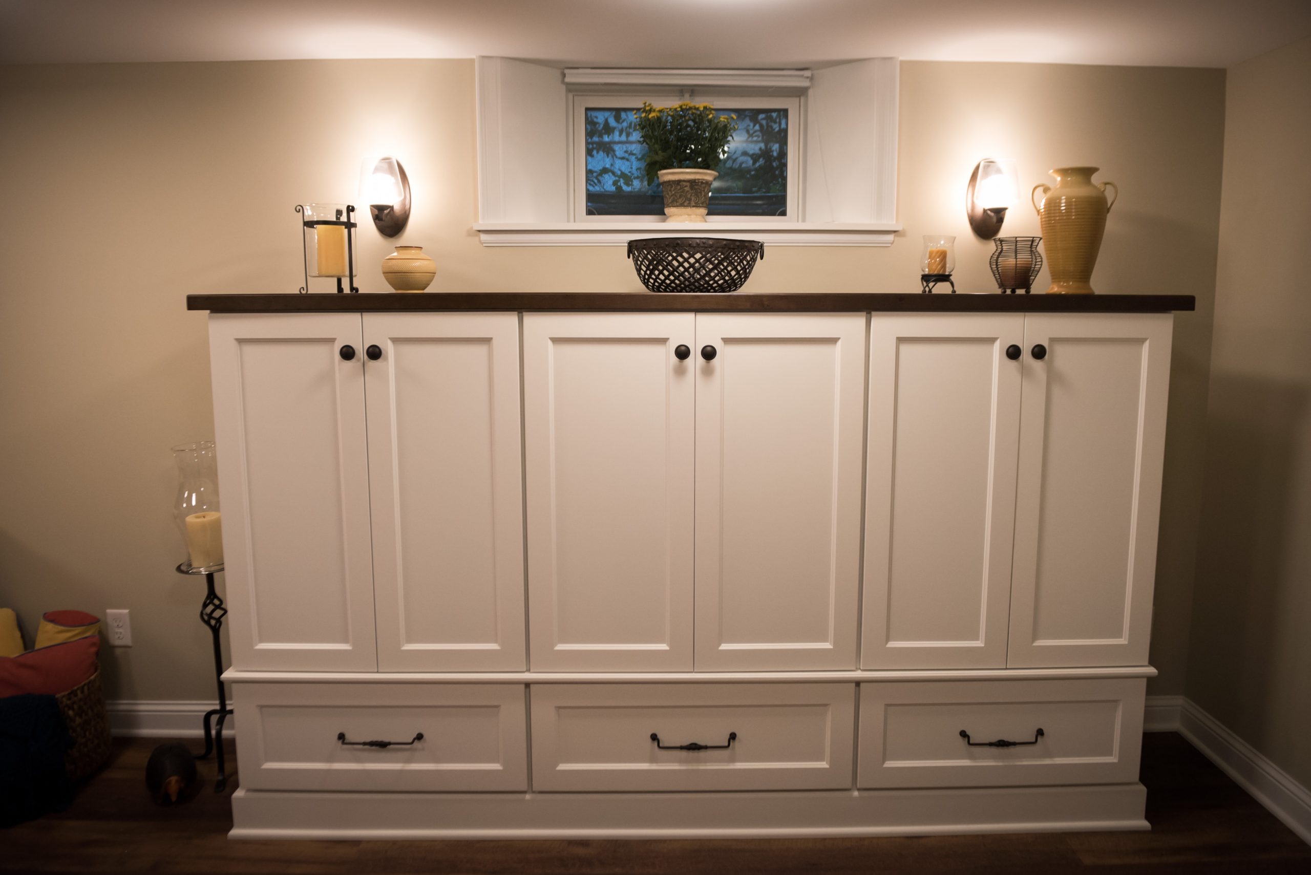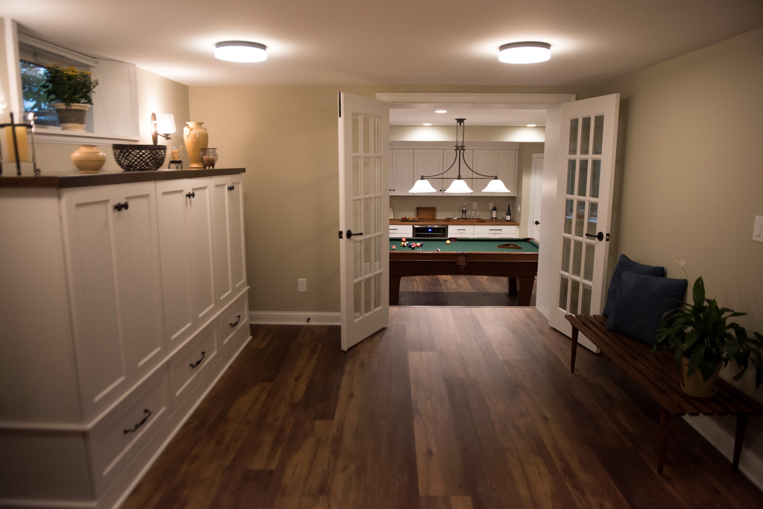 Next to the pool table, we added a pair of closets separated by built-in cabinets, and left space between the upper and lower cabinets so the pool players would have room for their cues.