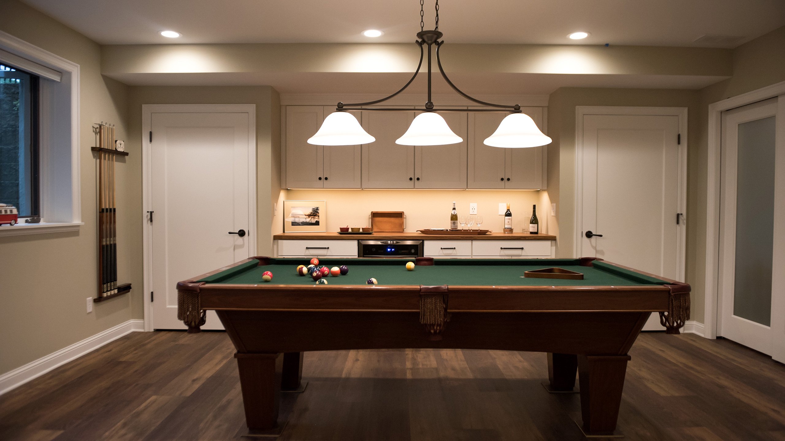 The family was ready to renovate the basement and create a space where they could hang out, watch TV, and play pool. Also on the list was a new workshop and a place for the dad to play his bass guitar.