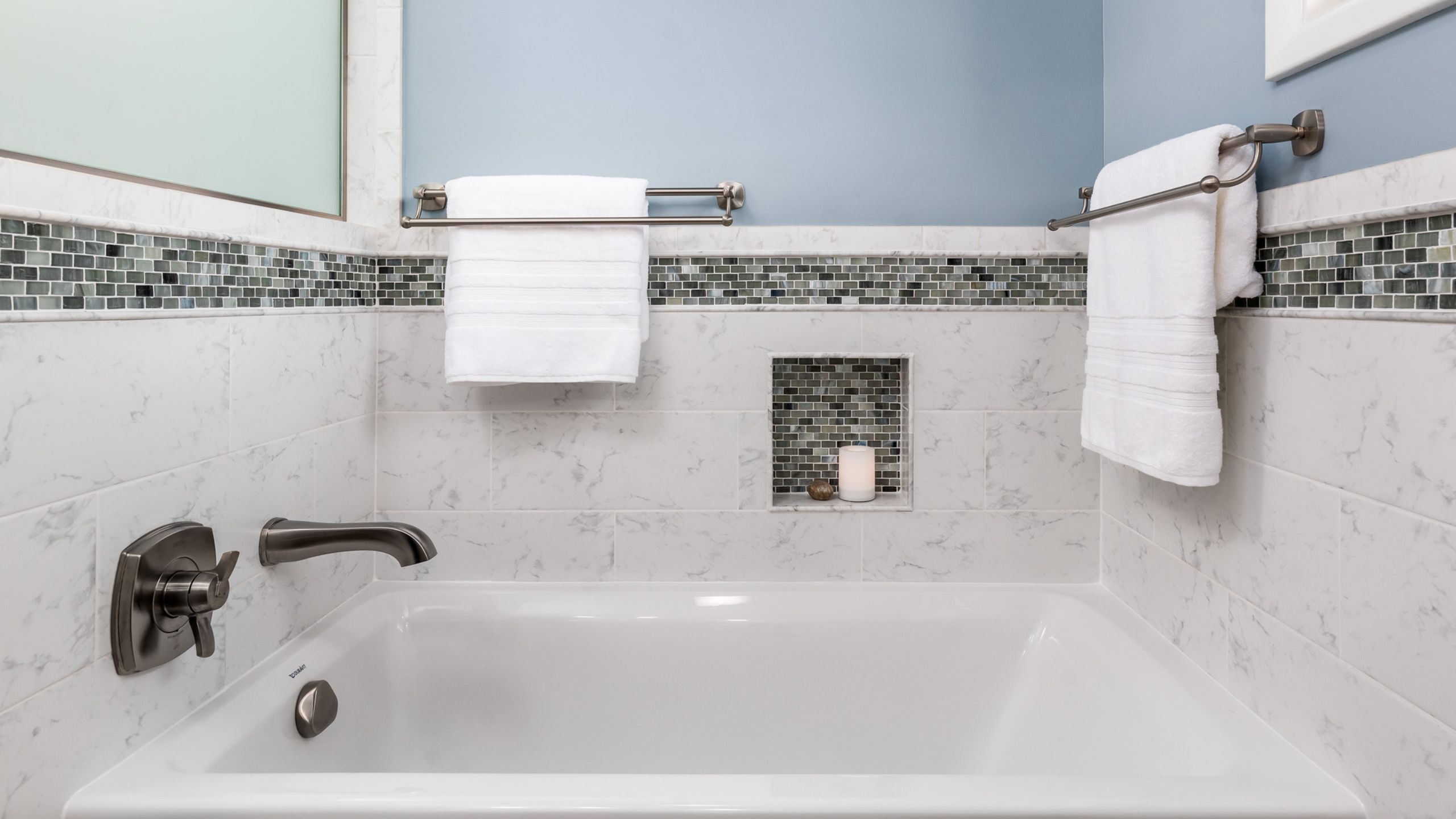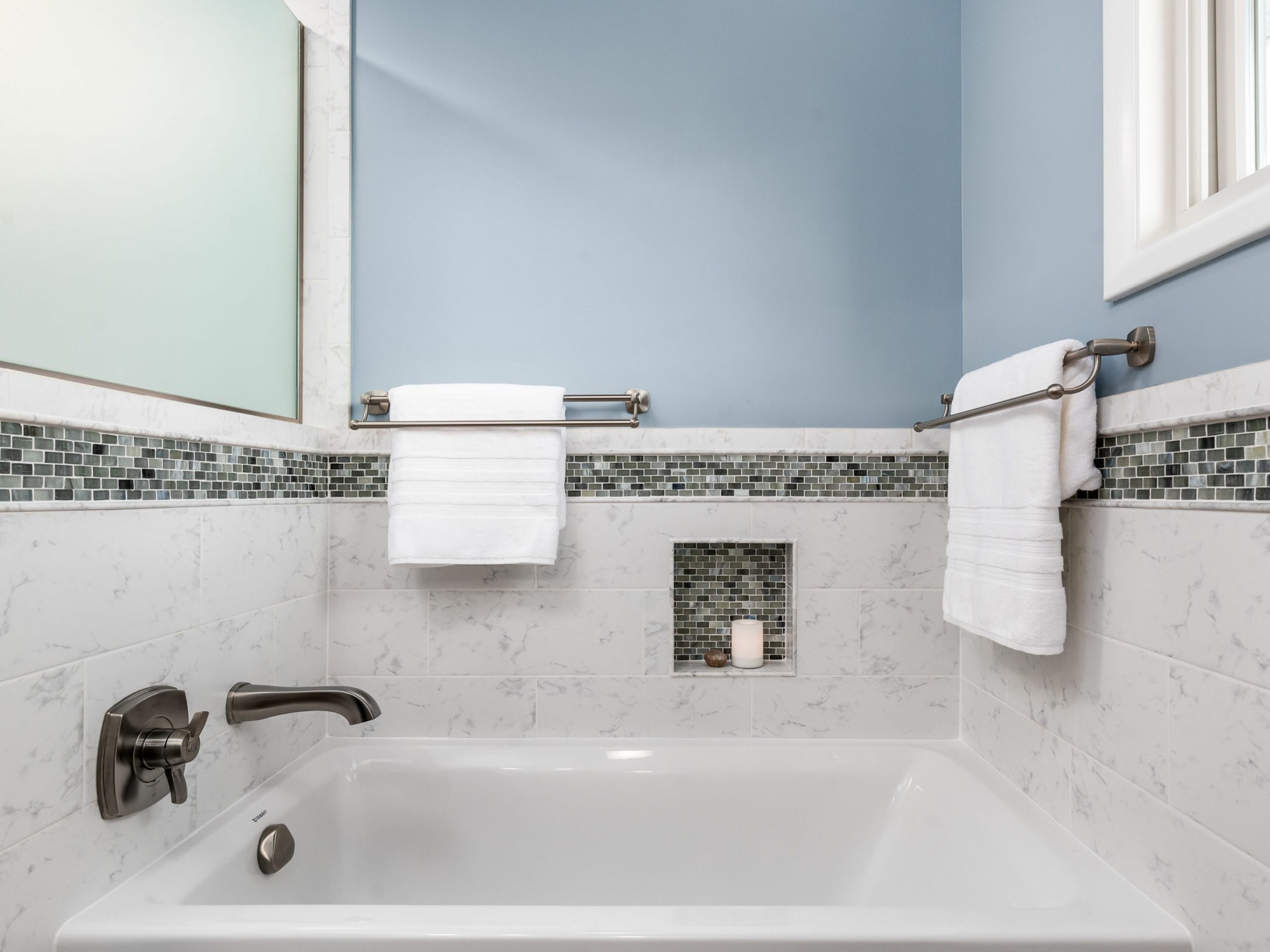 For design continuity, the tile wainscot and accent band flow into the shower. We also placed two grab bars—the vertical grab bar is there to assist with entering and exiting the shower, while the horizontal doubles as a towel rack and support bar.