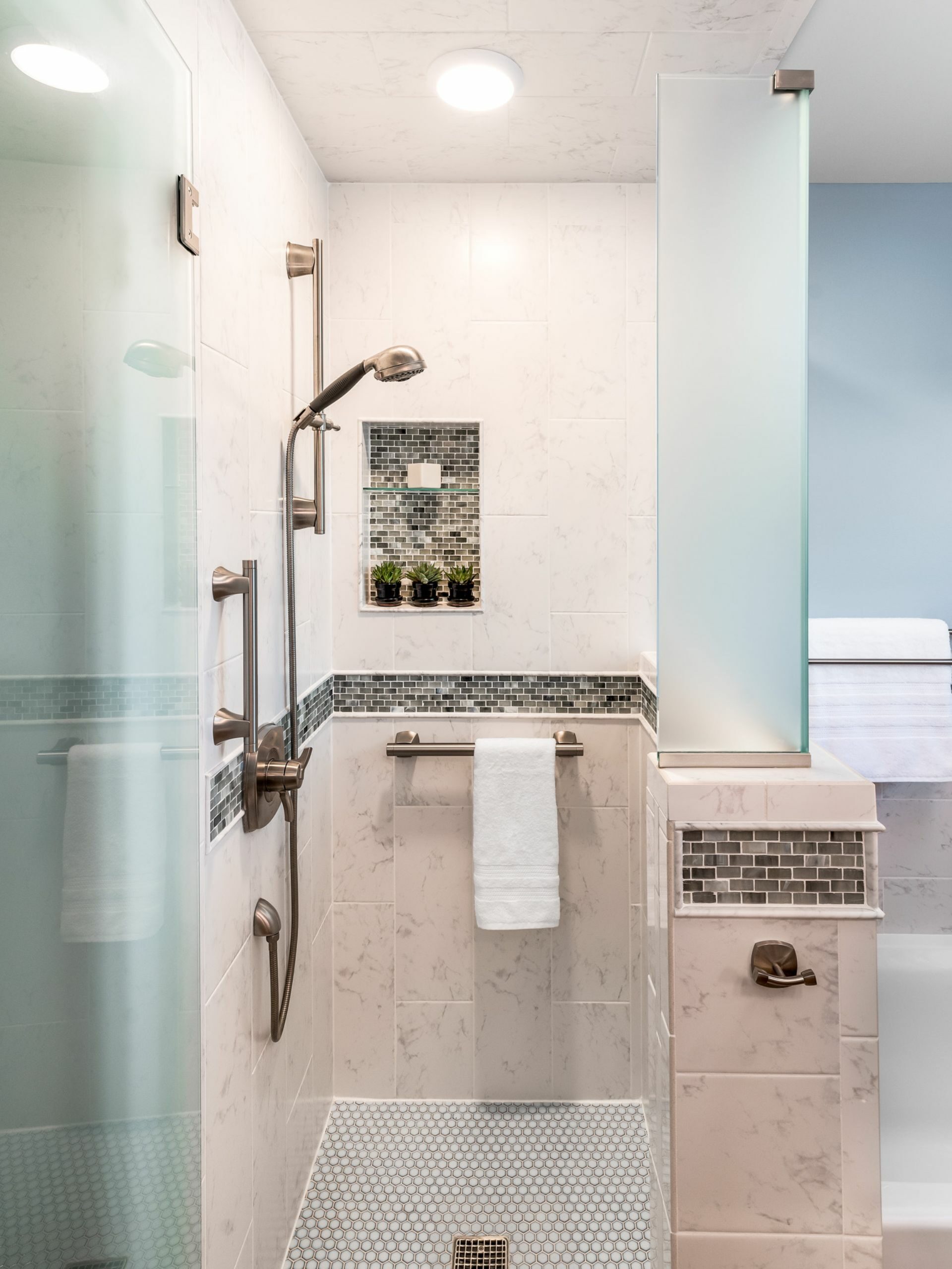 To brighten the shower space, we added recessed lighting and frosted glass on one wall which allows more natural light to flow through. Having more light is great for reading the small print on shampoo bottles, but it is also a great wake-up call in the morning. Notice how much bigger it feels too. In addition to more light, using a large format, light-colored tile creates the illusion that it is bigger.