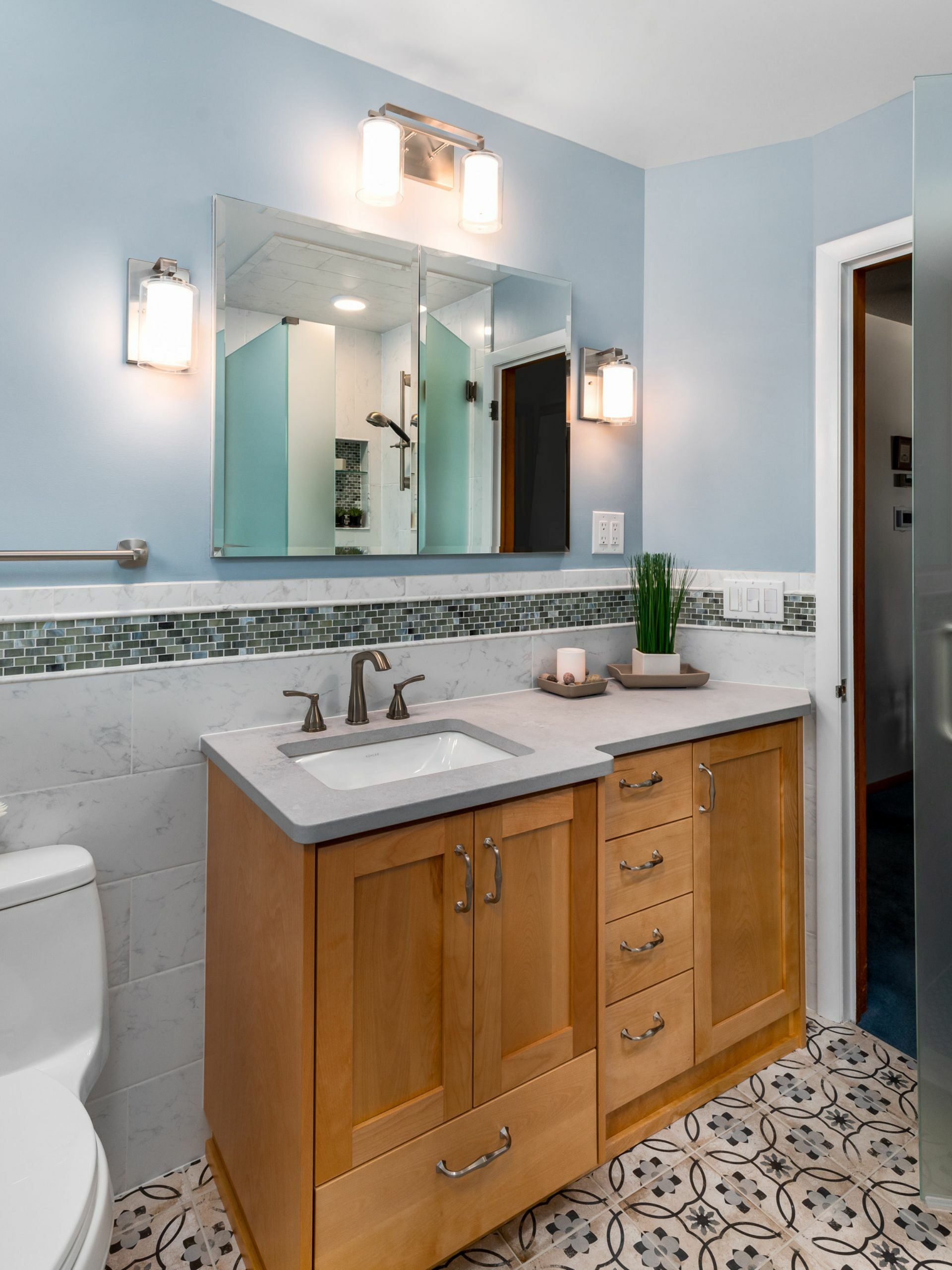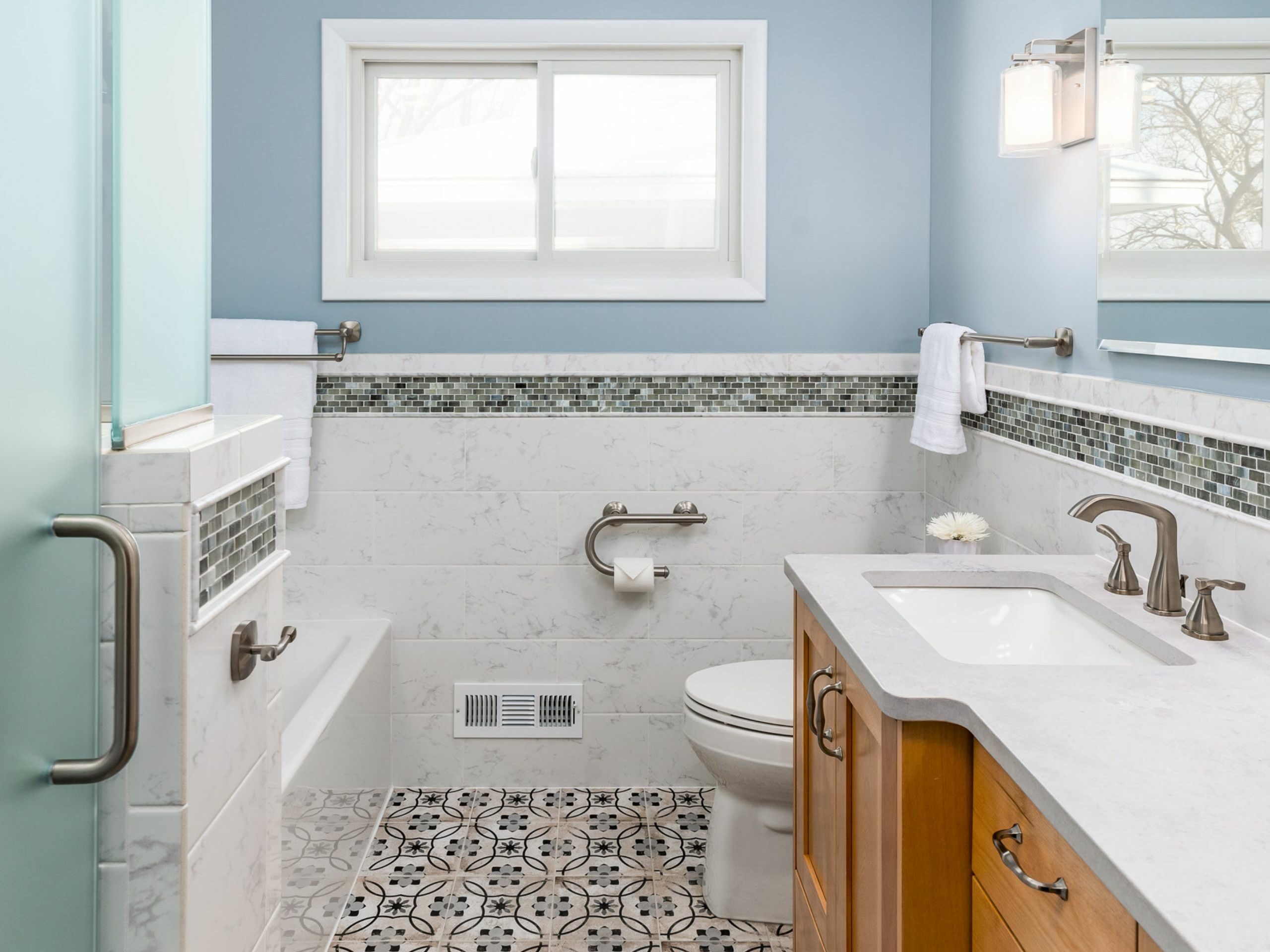 Wrapping around the bathroom is a tile wainscot with a detailed glass mosaic accent band. A large-format porcelain tile gives homeowners the best of both worlds. You get the high-end look and feel of marble, but is more cost-effective, durable, and requires very little maintenance. The floor tile is a vintage patterned tile in Monarch Gray and adds a pop of fun!