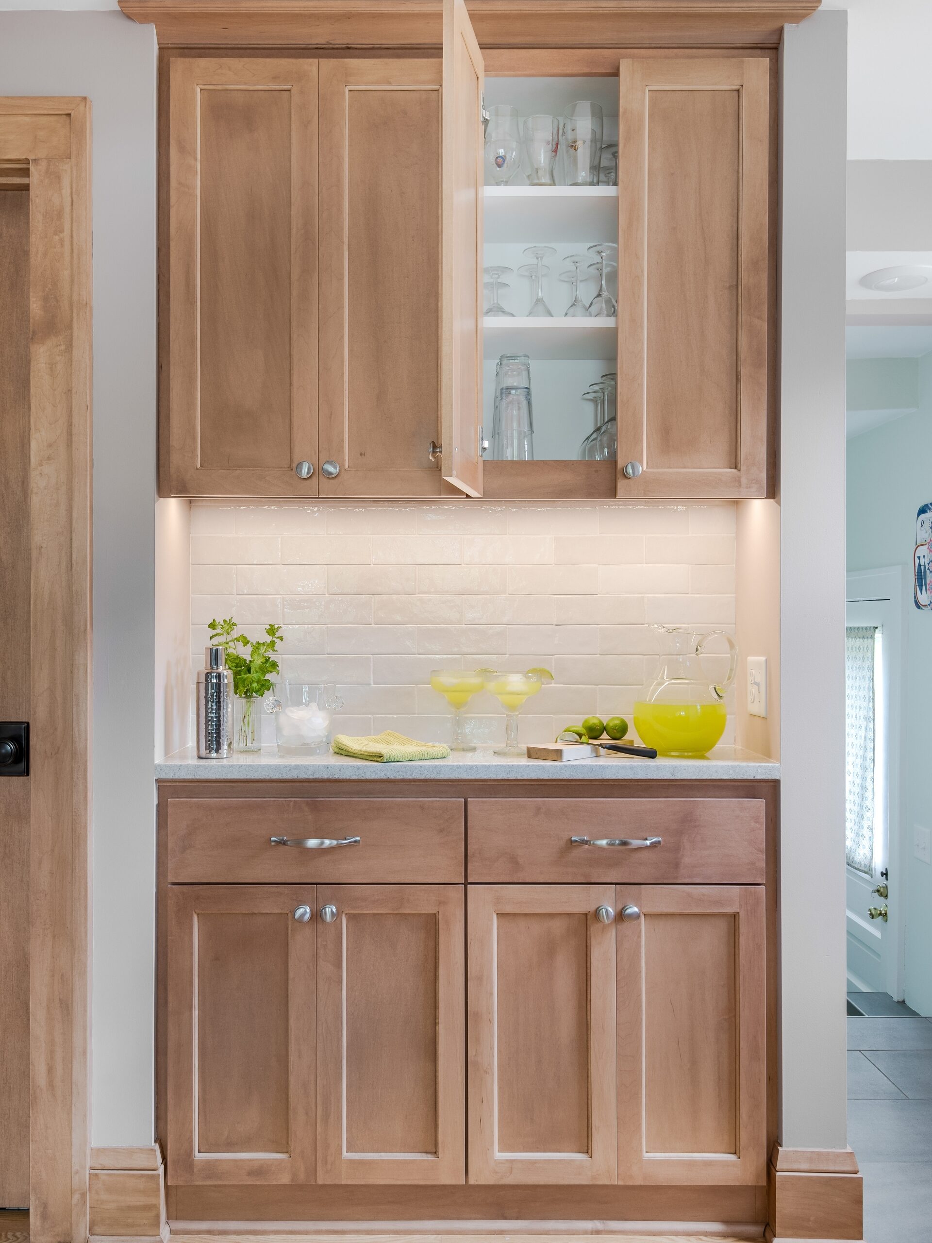 A custom-built cabinet near the dining area doubles as a cocktail bar. The homeowners even measured their plates to ensure the cabinetry was the exact depth they needed—form truly followed function. With enough counter space for mixing drinks and serving guests, the bar area adds a playful, personalized touch to the design.