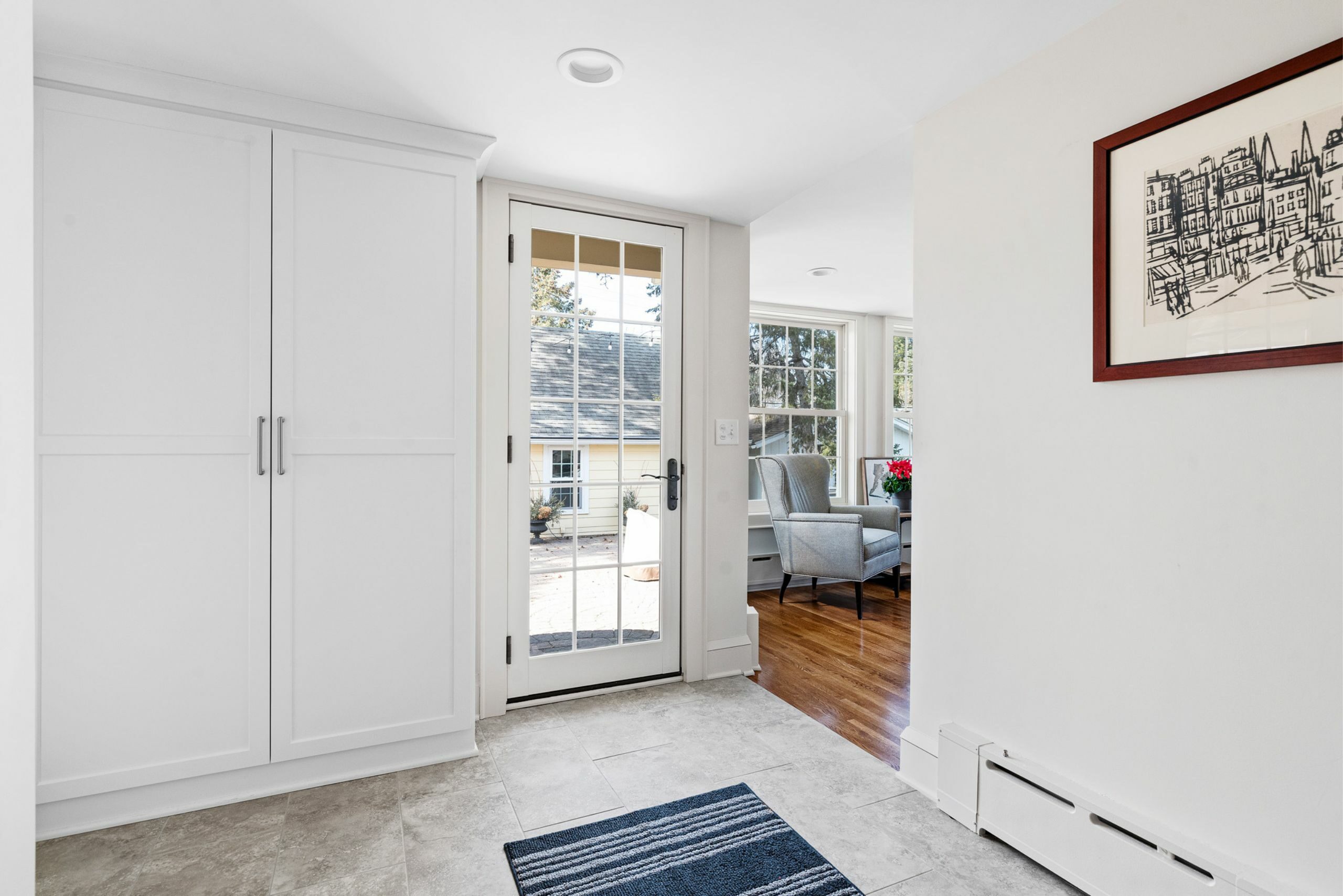A built-in coat closet keeps the back entry neat and tidy. Behind the complementing white shaker cabinet doors, there are pegs for hanging coats and shelves for shoes. Glass pane doors bring in lovely natural light.