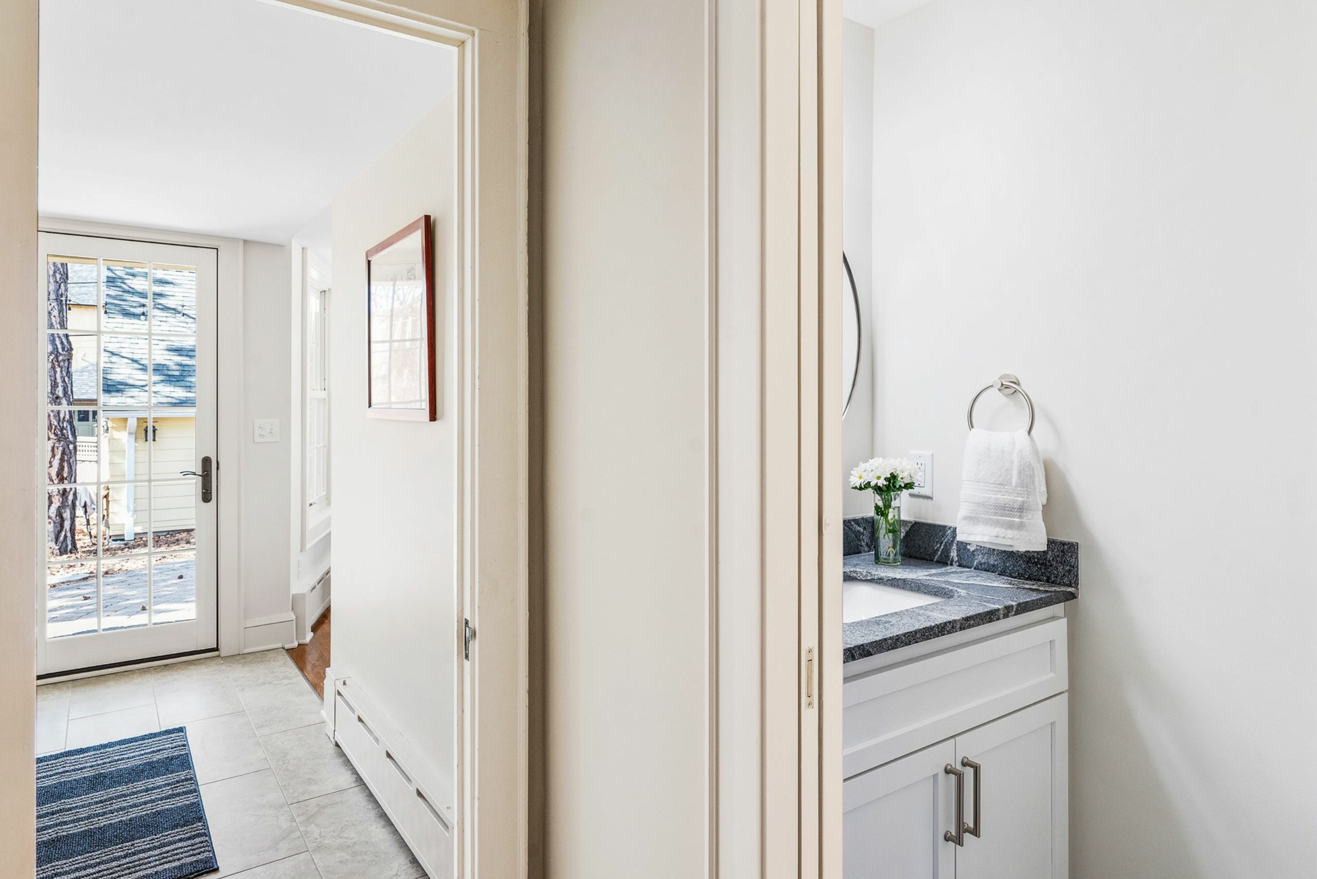 The bathroom at the back entry had a less-than-ideal placement, lacking privacy as it directly faced the kitchen and breakfast area. Additionally, the window opened directly onto the porch. To address this issue, we removed the post and relocated the powder room. As a result, we provided our clients with direct access to their porch, allowing them to easily grab a cup of coffee and enjoy a relaxing morning outdoors.